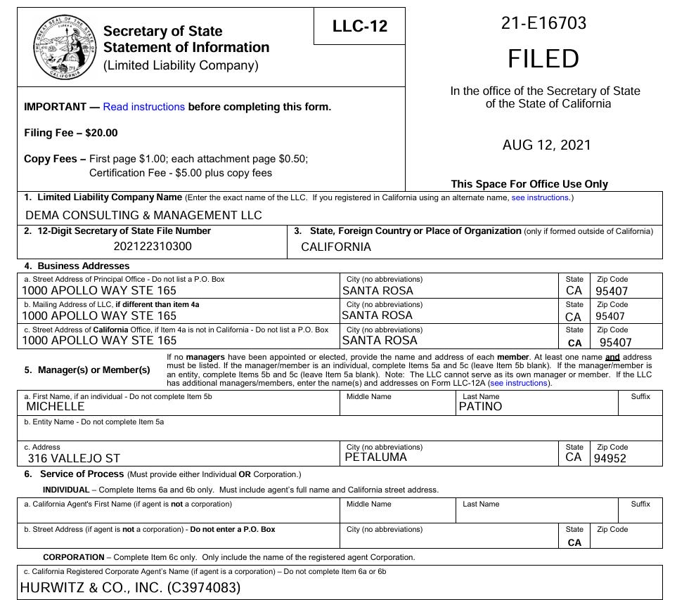 August 2021: DEMA submitted their corporate filing to the California Secretary of State.