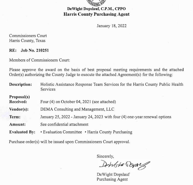 Feb 12, 2024: I received the following statement from Harris County employee DeWight Dopslauf (purchasing) in response to my emailed concerns (see attached). Ms Robinson was cc'd on this response: