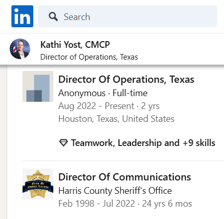 June 2022: Ms. Kathi Yost resigned from her position of 24.5 years as Director of Communications for the Harris County Sheriff's Office to become the Vice President of Operations for DEMA. She chose to leave the company name as ‘anonymous’ on her LinkedIn.