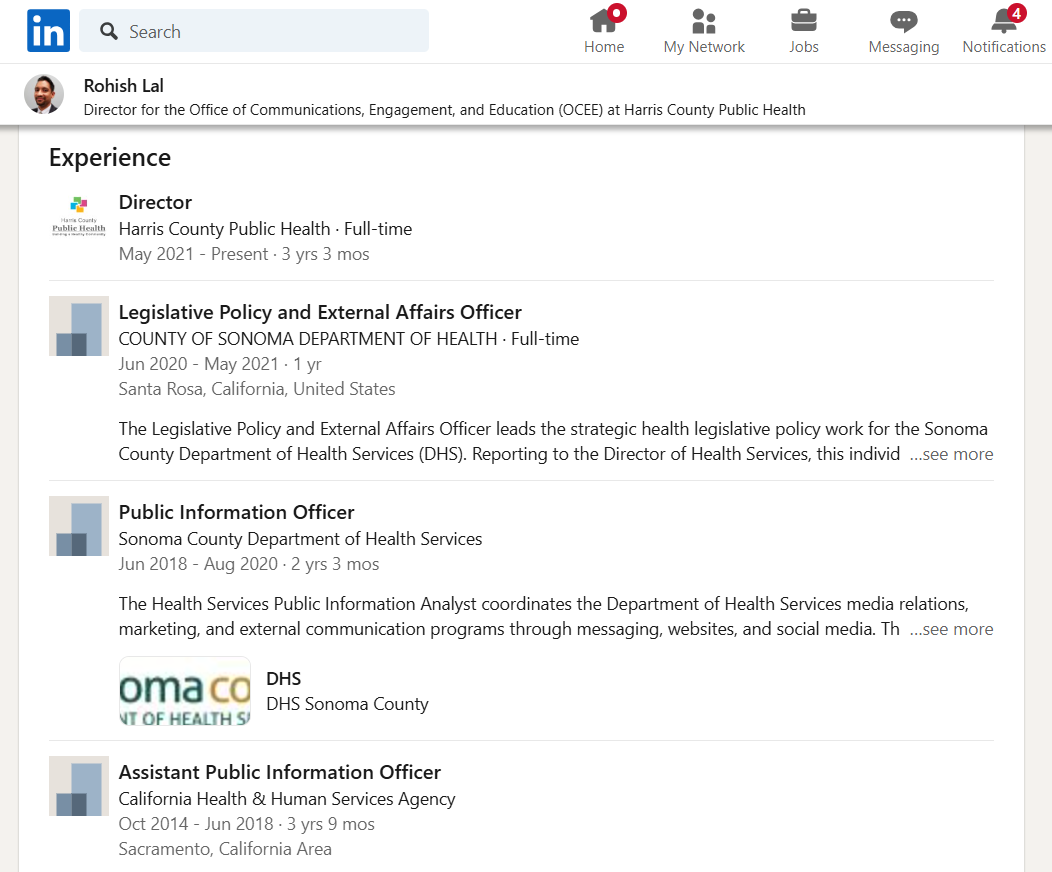 Her direct report, Mr. Rohish Lal oddly resigned within the same exact month as the Legislative Policy and External Affairs Officer, County of Sonoma and took a position as the Director of Government Affairs for Harris County, TX as well.