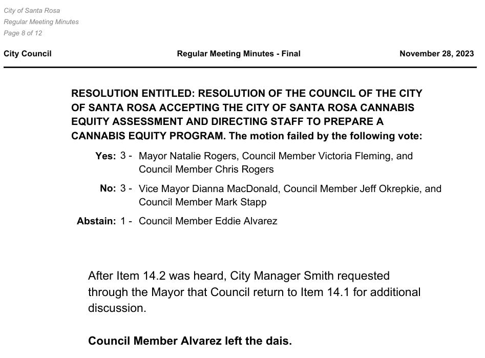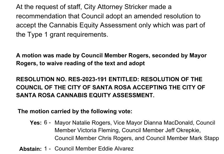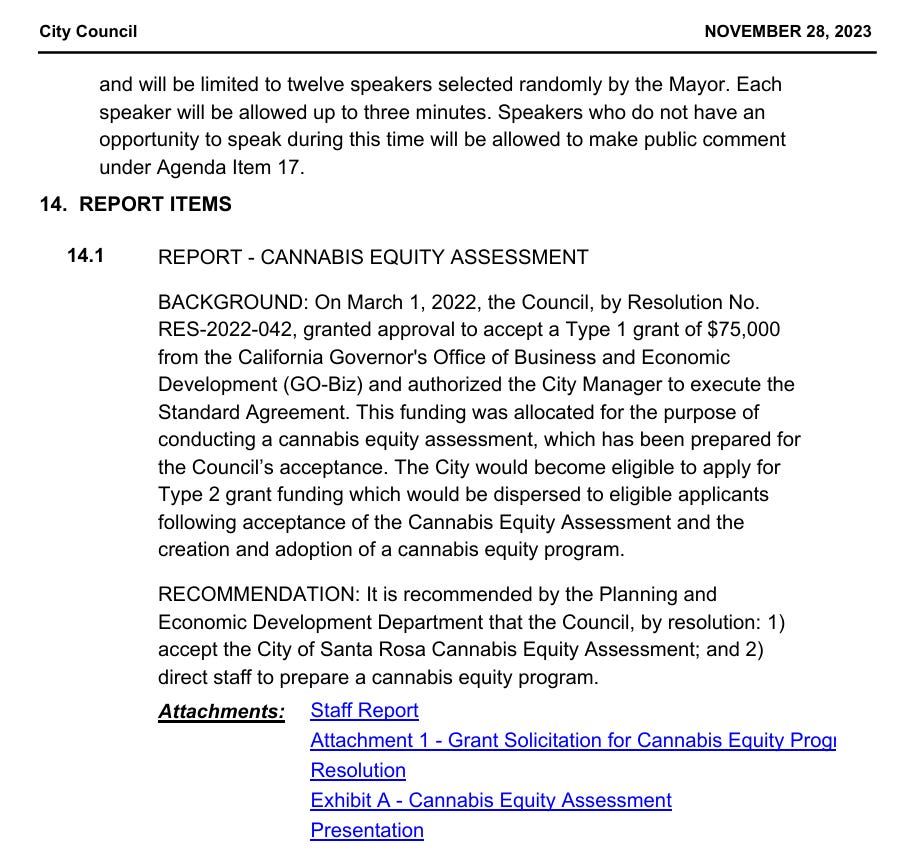 Shortly after Ms. Stricker was hired by the City of Santa Rosa, on November 28, 2023, a Cannabis Equity Assessment was presented for the Council’s acceptance.