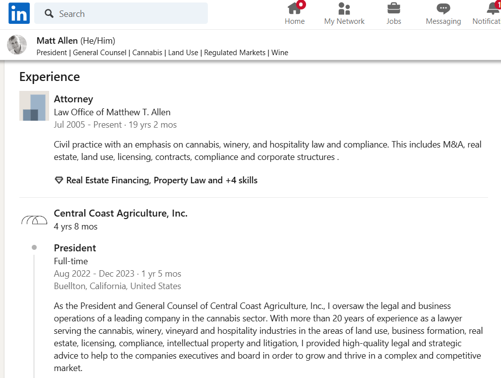 “As the President and General Counsel of Central Coast Agriculture, Inc., I oversaw the legal and business operations of a leading company in the cannabis sector. With more than 20 years of experience as a lawyer serving the cannabis, winery, vineyard and hospitality industries in the areas of land use, business formation, real estate, licensing, compliance, intellectual property and litigation, I provided high-quality legal and strategic advice to help to the companies executives and board in order to grow and thrive in a complex and competitive market.”