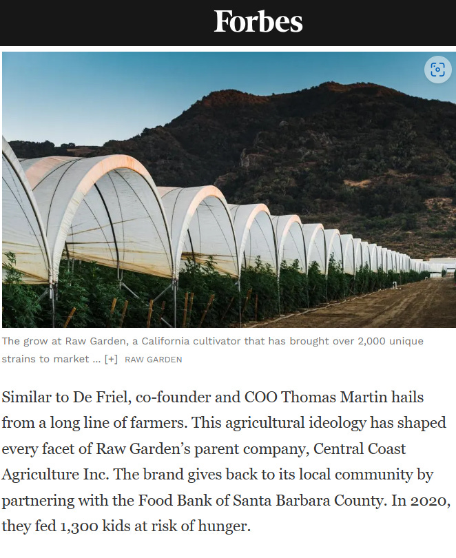 Per Forbes, Central Coast Agriculture appears to be the parent company of Raw Garden, California’s ‘best selling’ cannabis extracts.