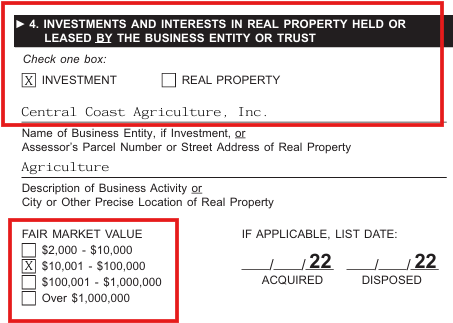 The Form 700 indicates that Mr. Croley’s law firm holds investments and interests in real property for Central Coast Agriculture, Inc, an ‘agriculture’ business entity.