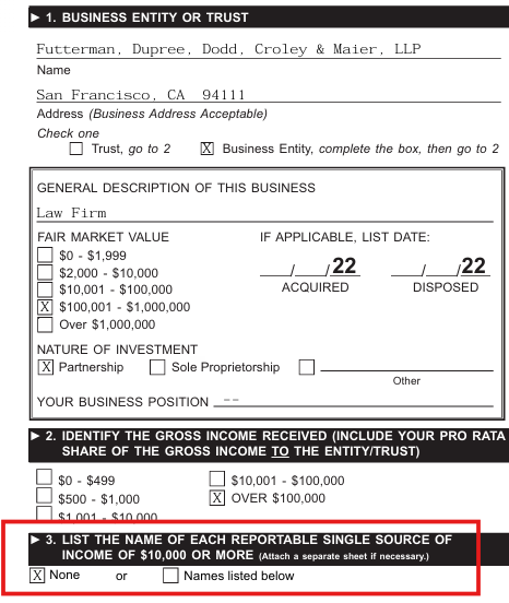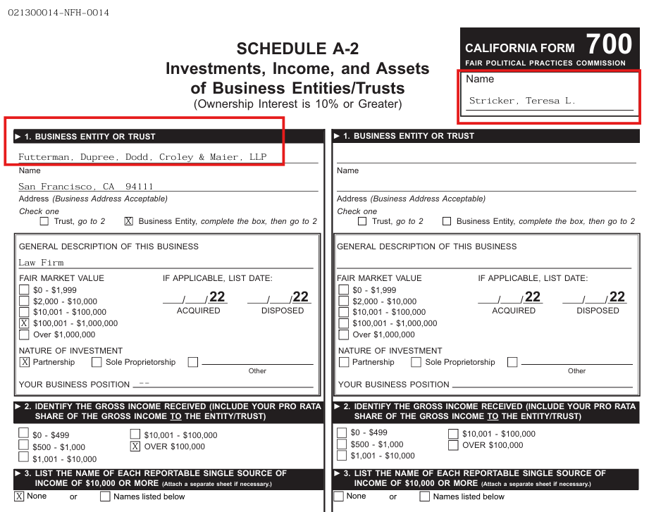 Ms. Stricker’s assuming office Form 700 submitted in November 2023 indicated that she is invested in a partnership for Futterman, Dupree, Dodd, Croley and Maier, LLP, a San Francisco based law firm.