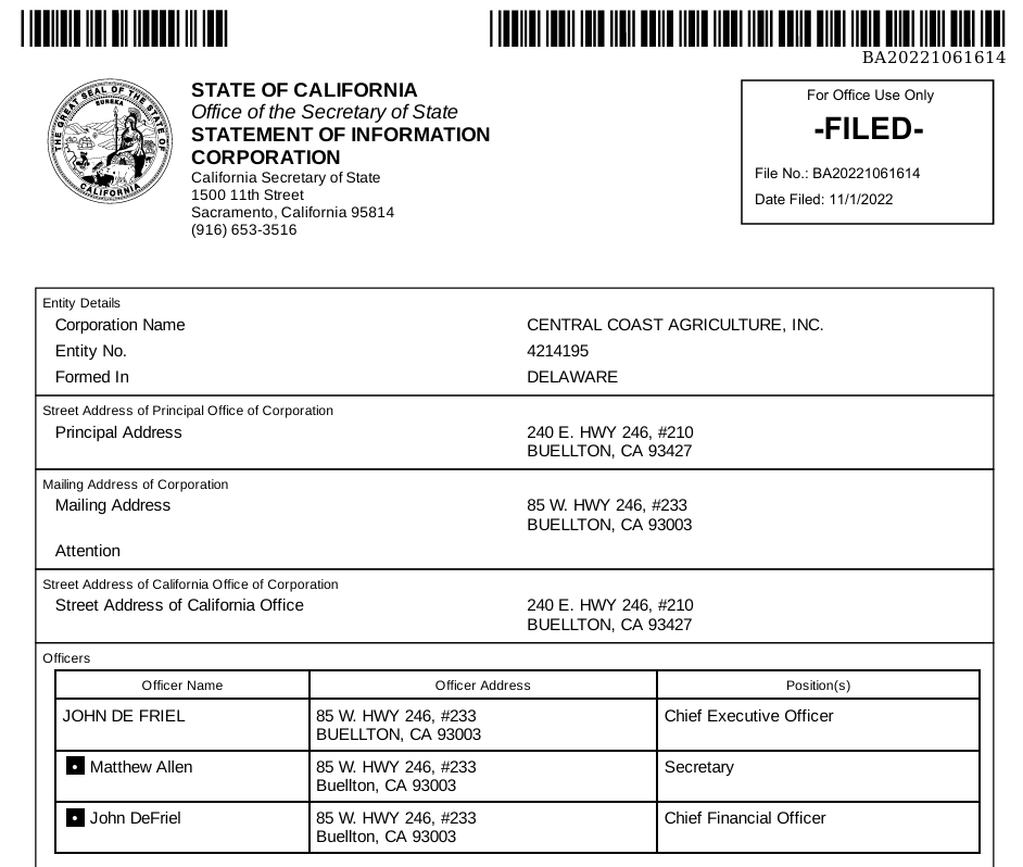 The California Secretary of State 2022 filing for Central Coast Agriculture, Inc. listed Mr. John De Friel as CEO/CFO and Mr. Matthew Allen as Secretary. The corporation was initially incorporated with the State in 2018.