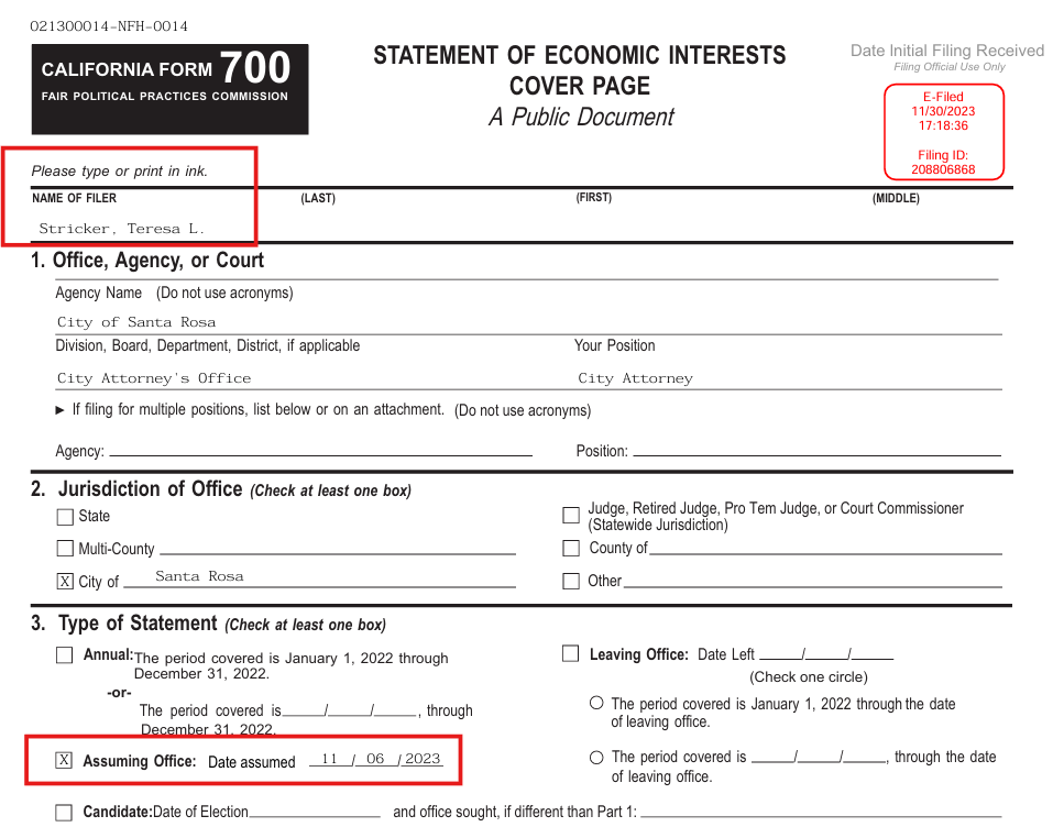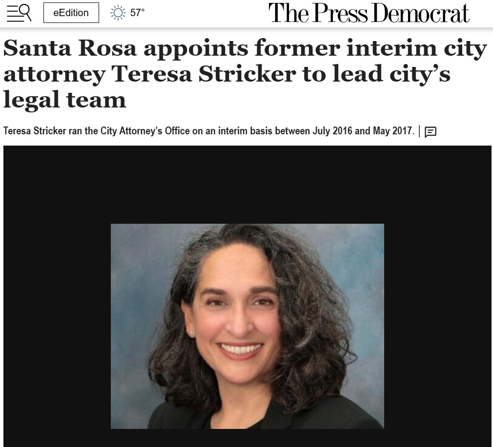 According to her statement of economic interest (Form 700), the City of Santa Rosa, CA Attorney, Theresa L. Stricker assumed office on November 6, 2023. Per The Press Democrat, she ran the City Attorney’s Office on an interim basis between July 2016 and May 2017.