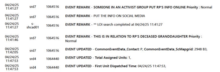 On April 24, 2025 SRPD released dispatch records for the Kingwood Residence. Records indicate that the police were called due to an activist group putting the deceased granddaughter’s info online.