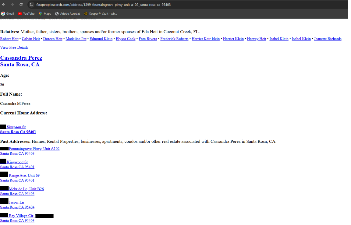 I will rely on the Duran / Perez Family to confirm prior addresses for Ms. Cassandra Perez based on the background check conducted. Once confirmed, additional dispatch records will be released. The unreleased records are frightening…