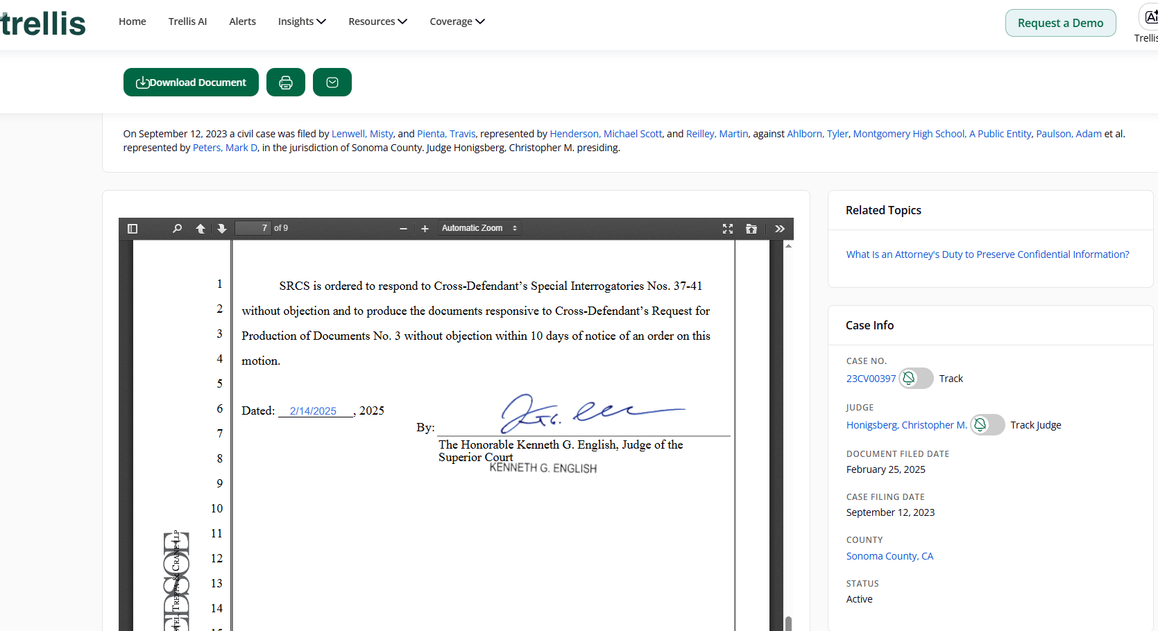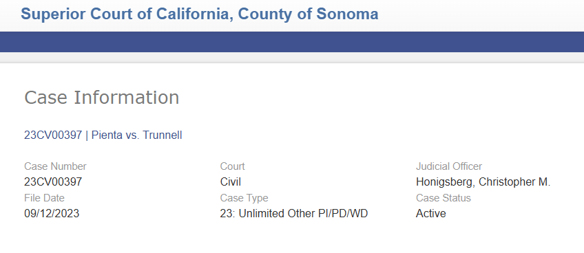 Sonoma County Superior Court Records indicate the lawsuit filed on behalf of Pienta’s parents has been active since September 12, 2023.
