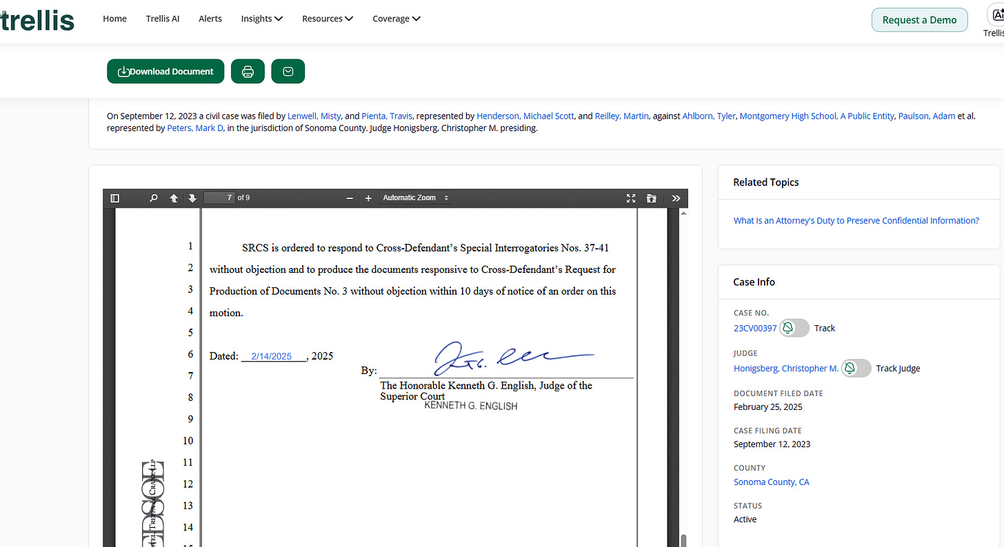 Defendants listed in the civil lawsuit include Montgomery High School; Santa Rosa City Schools; Santa Rosa High School District; district superintendent Anna Trunnell, former MHS principal Adam Paulson, and vice principal Tyler Ahlborn. The slain teen’s mother, Misty Lenwell, and father are named as the plaintiffs.