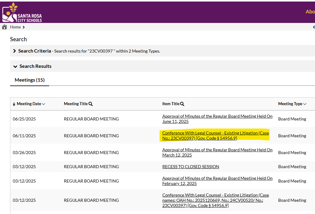 The Santa Rosa City Schools District Board last discussed the existing litigation in closed session on June 11, 2025.