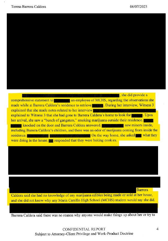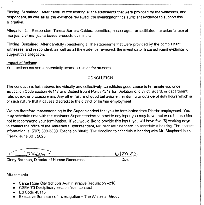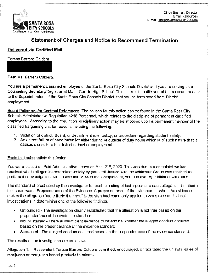 Ms. Teresa Barrera Caldera, Counseling Secretary/Registrar for Maria Carrillo High School (MCHS), was recommended for termination by the Santa Rosa City Schools District (SRCS) after allegedly providing/consuming marijuana with students at her home.