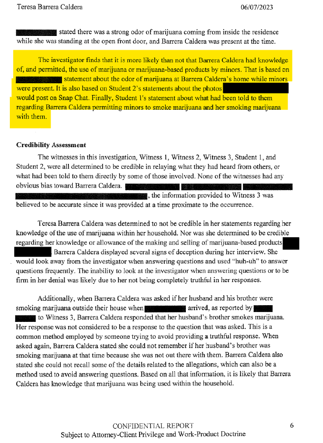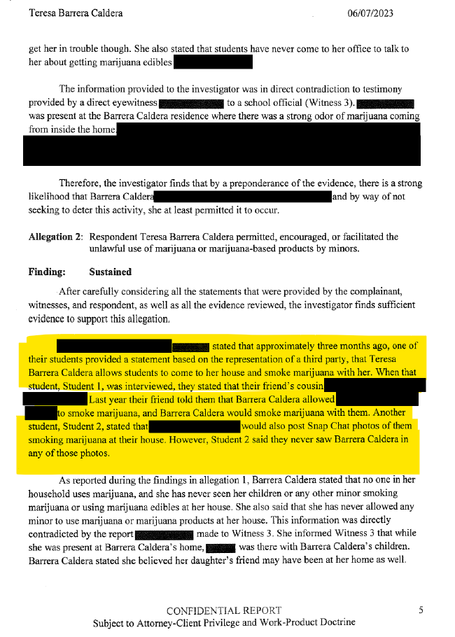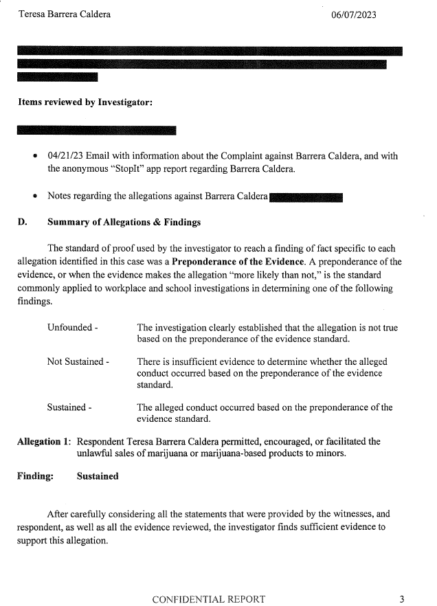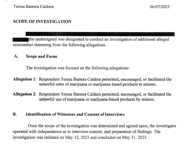 The investigation focused on Barrera’s encouragement, facilitation and unlawful sales of marijuana, or marijuana-based products to minors. A preponderance of evidence found that the allegations were sustained.