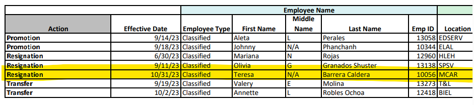 According to the SRCS Board approved personnel transactions, Ms. Barrera Caldera resigned effective 10/31/2023.