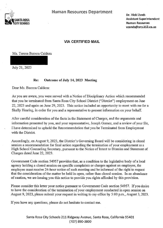 On July 21, 2023, Ms. Vicki Zands, SRCS Assistant Superintendent of Human Resources, provided Ms. Barrera Caldera with a letter informing her of the district’s recommendation of termination, and opportunity to engage in a Skelly Hearing.