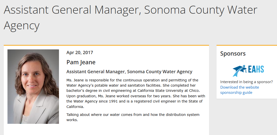 Prior to retiring in November 2024, Ms. Pamela Jeane served as the Sonoma County Water Agency’s Deputy Chief Engineer Operations And Assistant General Manager For Water And Wastewater Operations.