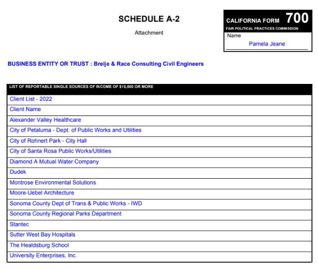 Why did the Sonoma County Water Agency and Board of Supervisors fail to recognize the conflict of interest presented regarding Brelje & Race in public contracts? From dozens of competitors, how was the firm selected virtually every single time? Did Ms. Jeane and her spouse influence contracts in any way?