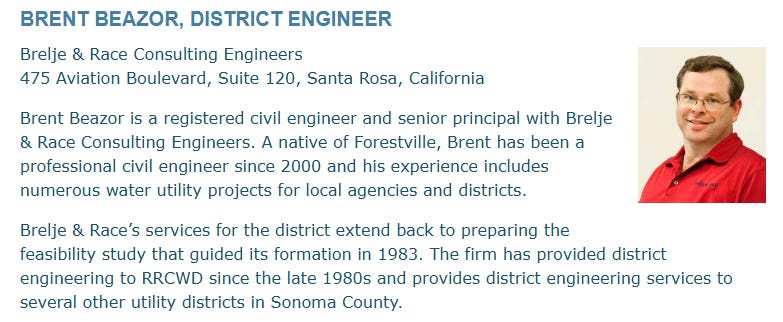 Mr. Brent Beazor, District Engineer of the Russian River County Water District, is a senior principal with Brelje & Race Consulting Engineers.