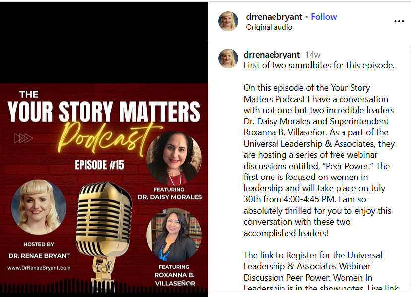 On this episode of the Your Story Matters Podcast I have a conversation with not one but two incredible leaders Dr. Daisy Morales and Superintendent Roxanna B. Villaseñor. As a part of the Universal Leadership & Associates, they are hosting a series of free webinar discussions entitled, “Peer Power.” The first one is focused on women in leadership and will take place on July 30th from 4:00-4:45 PM. I am so absolutely thrilled for you to enjoy this conversation with these two accomplished leaders!