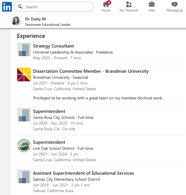 After a turbulent tenure as superintendent of Santa Rosa City Schools, Daisy Morales has resurfaced in a new role as Strategy Consultant with Universal Leadership & Associates.