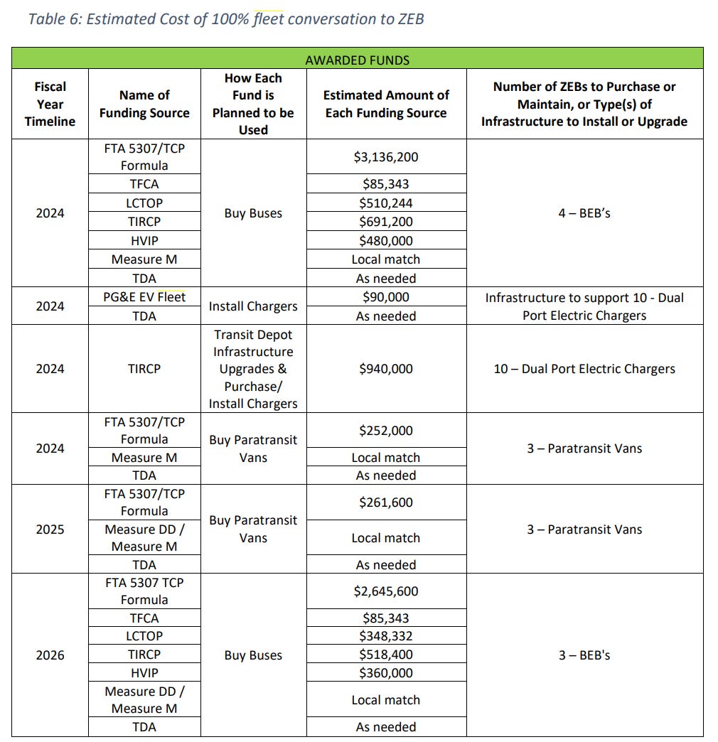 The Petaluma City Council has made a commitment towards being 100% carbon neutral (i.e. zero emission) by 2030. Following the awarded and projected funding that is shown in Table 7, this goal would be achieved by as early as 2030 for the Petaluma Transit fleet. Based on 2023 prices, about $17 million is needed to purchase 14 battery-electric buses and 10 battery-electric paratransit vans. Due to the Federal Transit Administration (FTA) defining the bus service life as 15 years and paratransit van service life as 8 years until federal funds can be used to replace the vehicle, it is not feasible to use federal funds to reach the 100% zero-emission goal by 2030. About $9 million would be needed from non-federal funding sources to reach this goal by 2030.