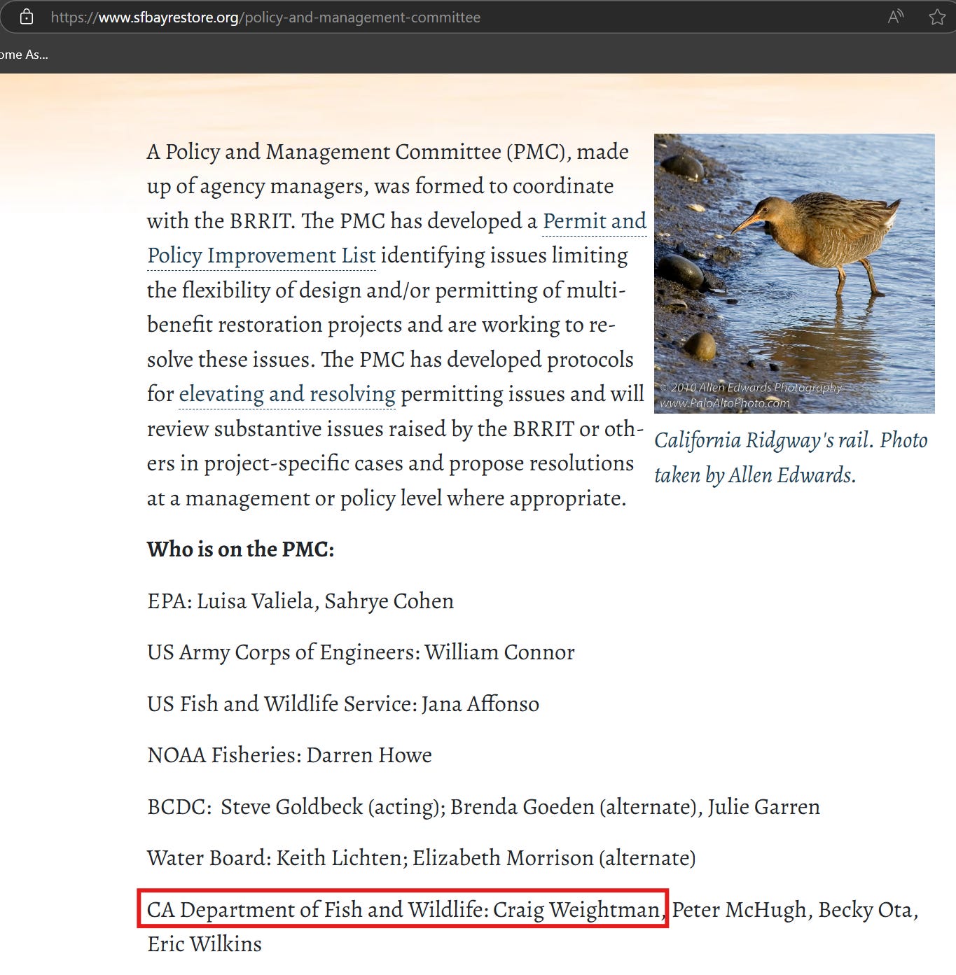 His bio for the Advisory Committee indicates that he contributed to the Cutting the Green Tape initiative to accelerate the permitting of restoration projects.