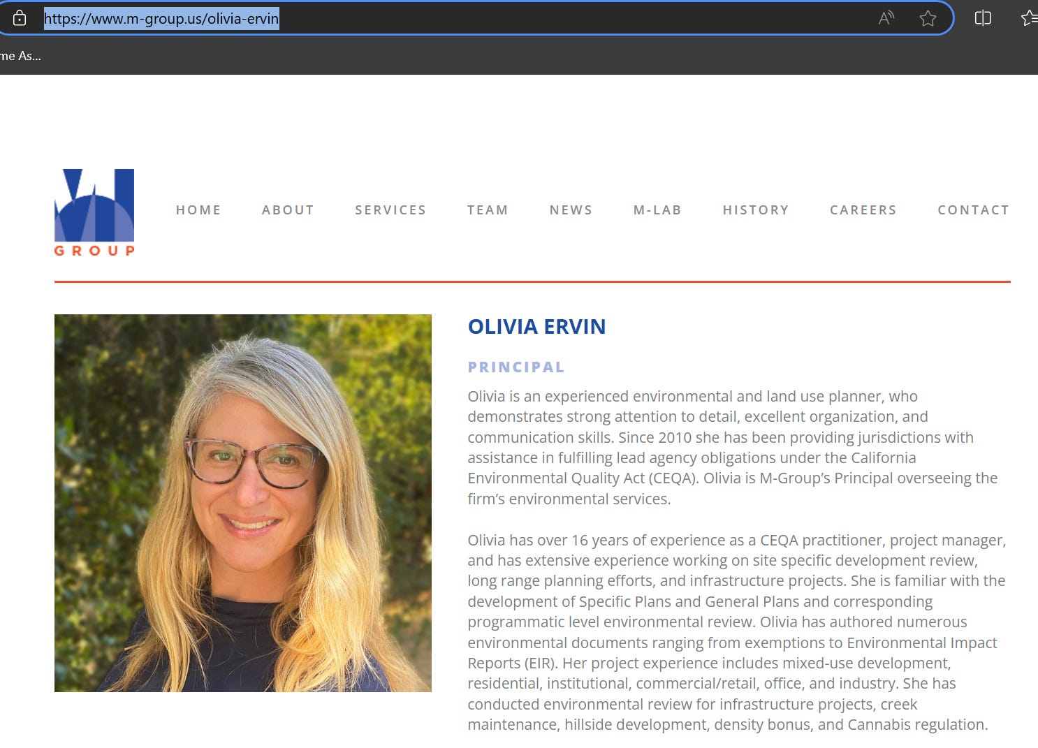 According to her resume, Ms. Olivia Ervin has served as an Environmental Planner for M-Group since 2013. Their website indicates that she has since been promoted to Principal.