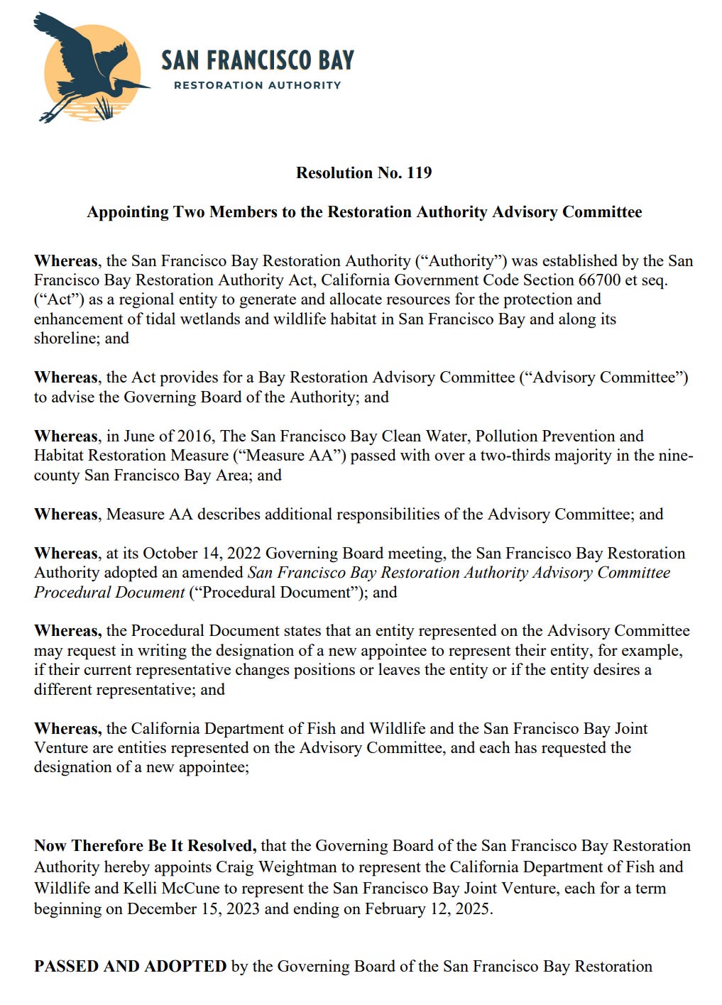 As of December 15, 2023, Mr. Weightman was appointed to the Governing Board of the San Francisco Bay Restoration Authority’s Advisory Committee for a term ending on February 12, 2025.