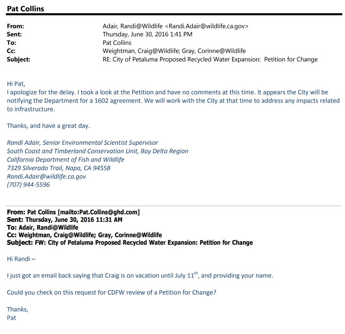 On June 30, 2016, Randi Adair, Senior Environmental Scientist Supervisor, South Coast and Timberland Conservation Unit, Bay Delta Region California Department of Fish and Wildlife, sent the following response to Pat Collins. Mr. Weightman was copied on the email thread while away on vacation.
