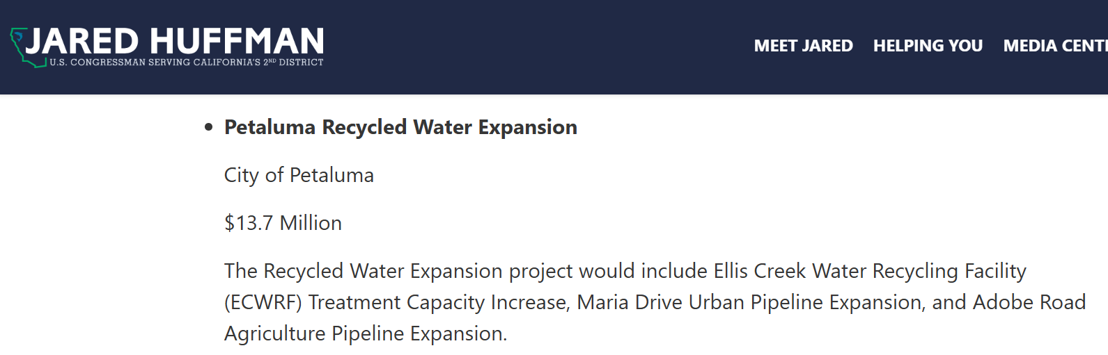 $13.7M was disbursed to the City of Petaluma for The Recycled Water Expansion project would include Ellis Creek Water Recycling Facility (ECWRF) Treatment Capacity Increase, Maria Drive Urban Pipeline Expansion, and Adobe Road Agriculture Pipeline Expansion.