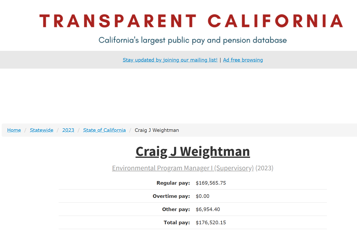 As of 2023, Transparent California indicated that Mr. Weightman was actively employed as Environmental Program Manager I (Supervisory) for the California Department of Fish and Wildlife.