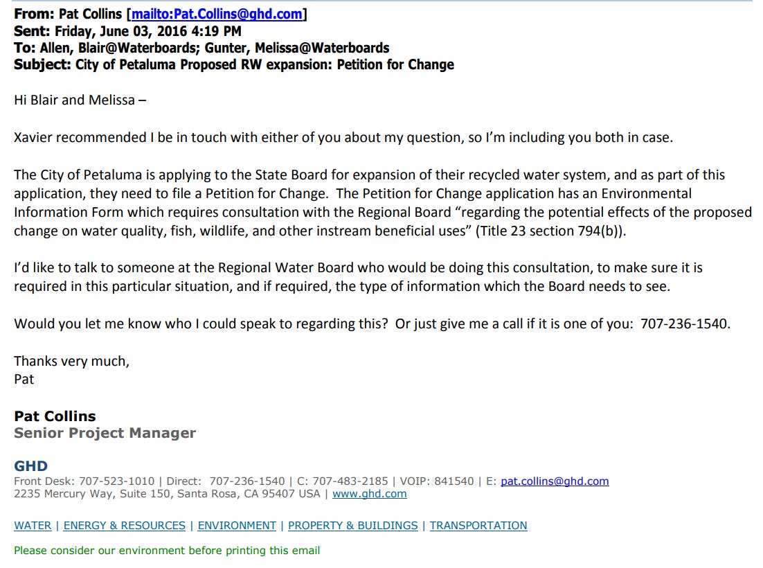 On June 3, 2016, the City of Petaluma’s Senior Project Manager, GHD issued a Petition for Change request to the State Water Resources Control Board and San Francisco Bay Regional Water Quality Control Board for their proposed Urban Recycled Water Expansion Project.