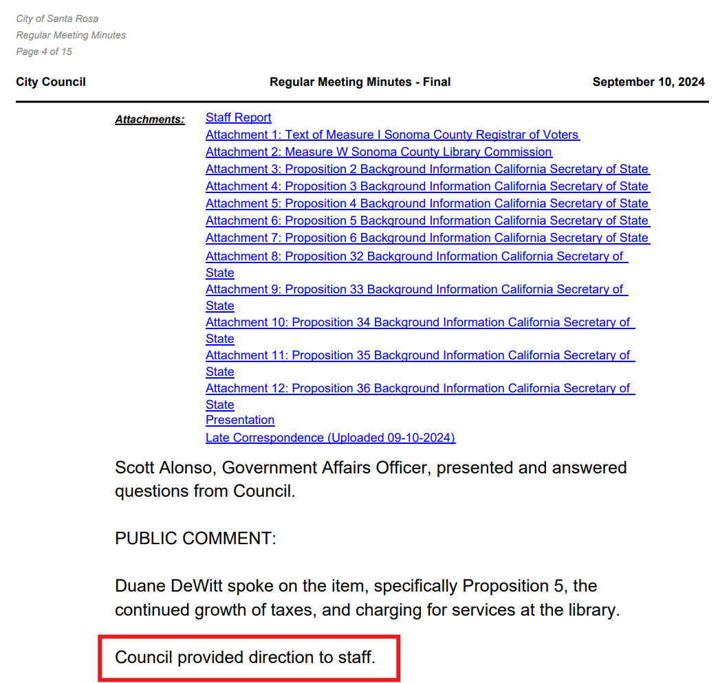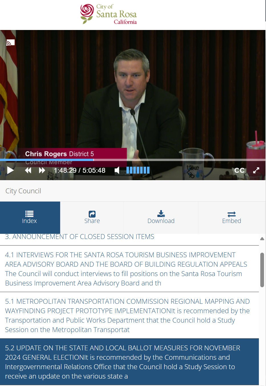On September 10, 2024, the City of Santa Rosa Council held a Study Session for Council to receive an update on the various state and local ballot measures and discuss possible Council action to support or oppose these measures. This item was provided for Council’s information and no action was required to be taken except for possible direction to staff for the September 24 council meeting.