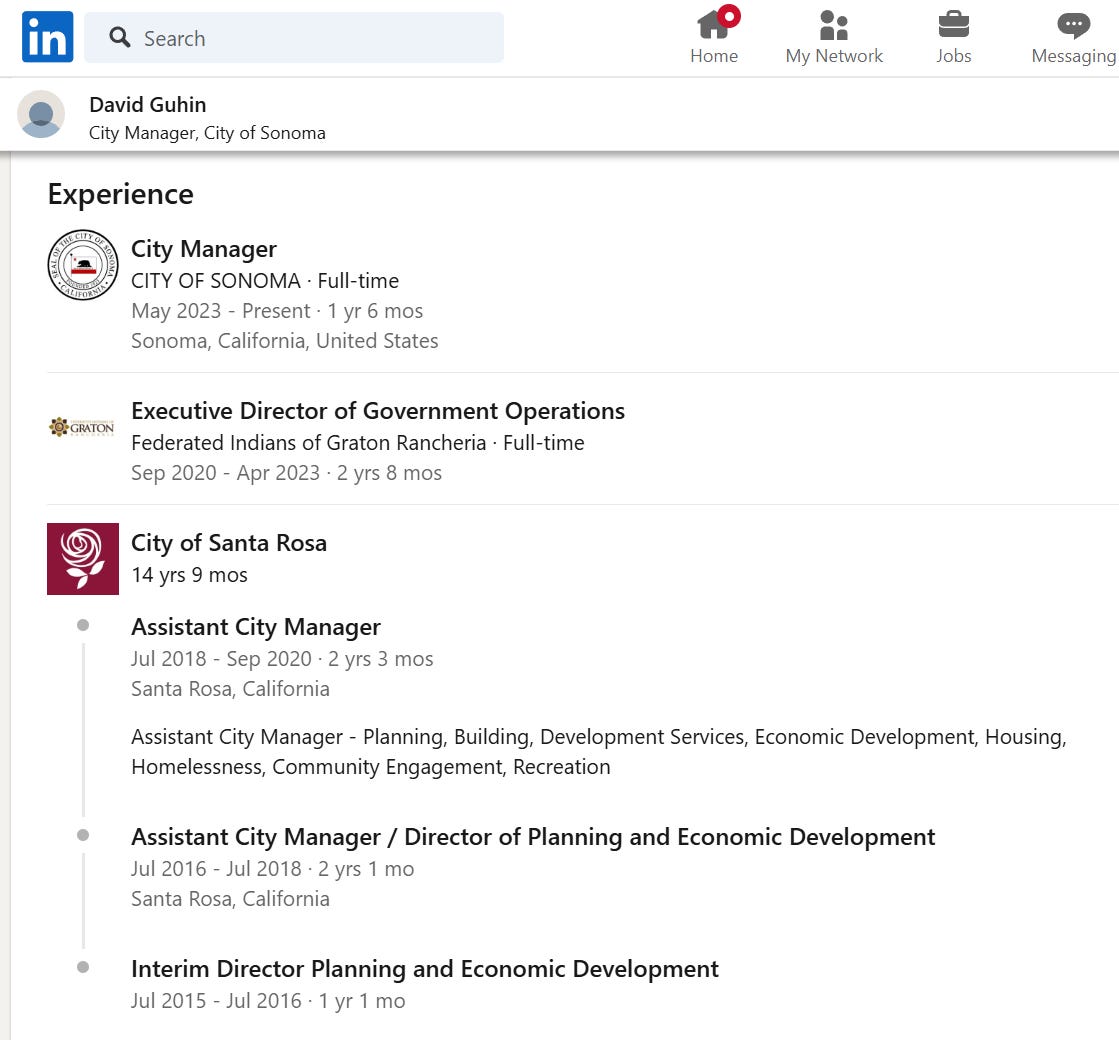 She served within the City alongside her significant other, Mr. David Guhin, former Assistant City Manager, City of Santa Rosa.