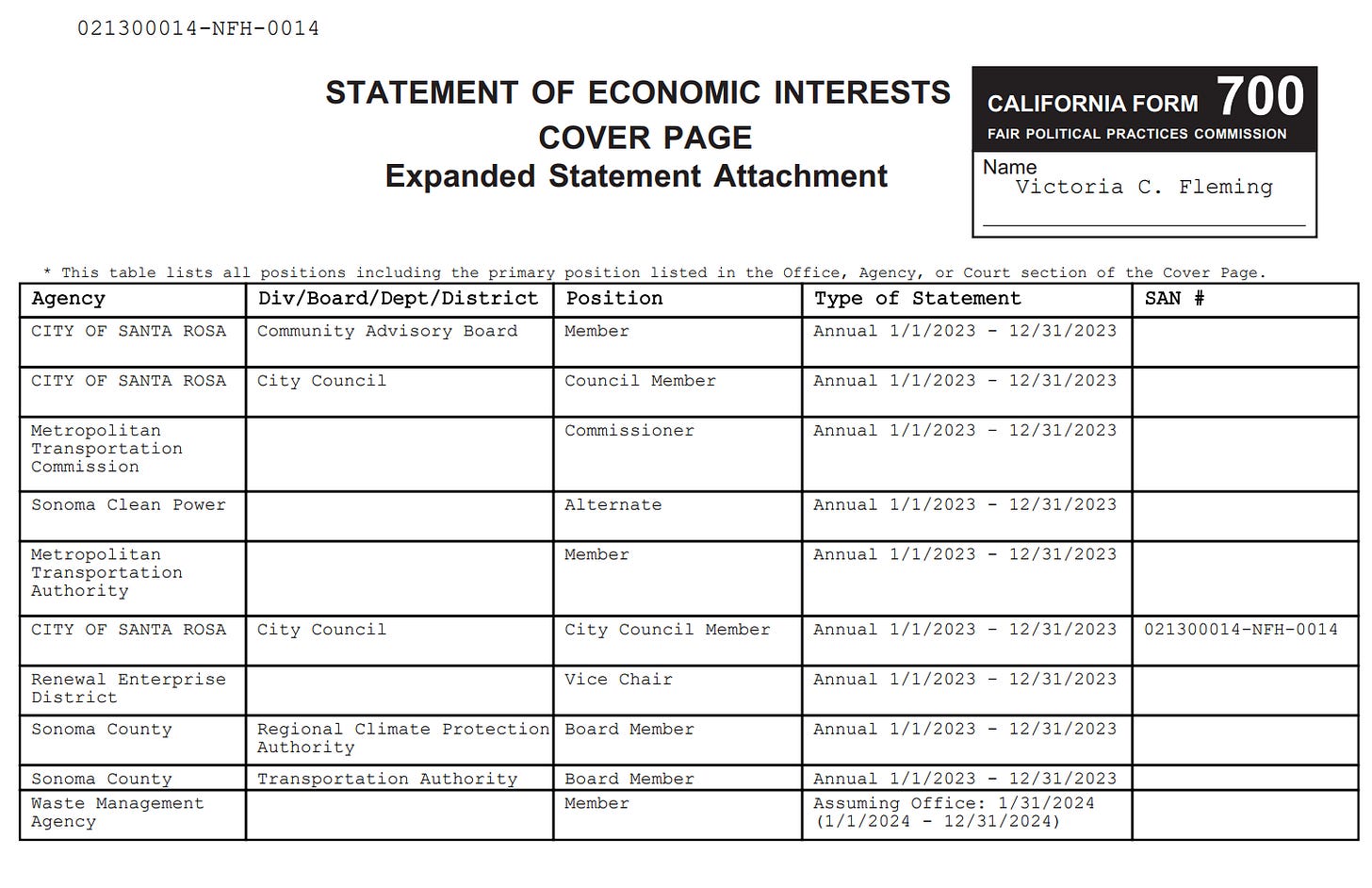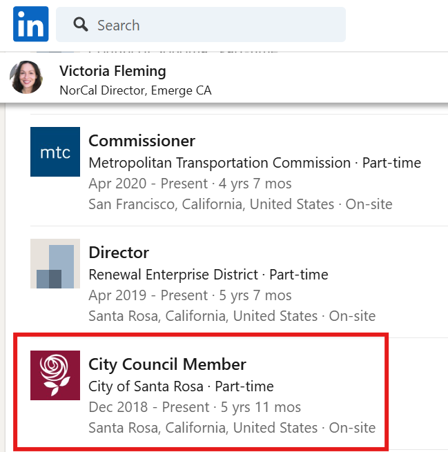 Ms. Fleming’s LinkedIn profile indicated that she has served on the Santa Rosa Council since 2018.