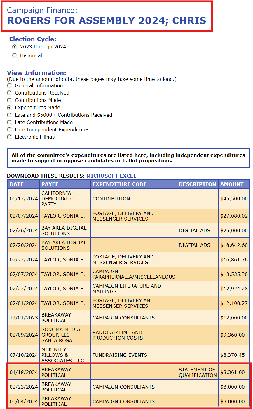 According to Cal-Access, Mr. Rogers has frequently utilized Mr. Leo Buc’s campaign consulting firm, Breakaway Political for his 2024 Assembly campaign.