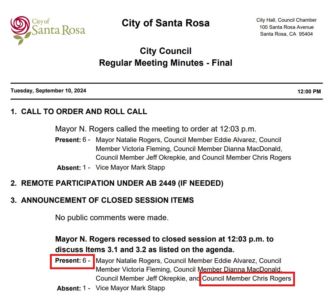 Although Mr. Rogers was absent for the September 24, 2024 Council Meeting, the September 10, 2024 Minutes indicated that he and Councilwoman Victoria Fleming failed to recuse themselves from the Study Session to direct staff in preparation for the 24th.