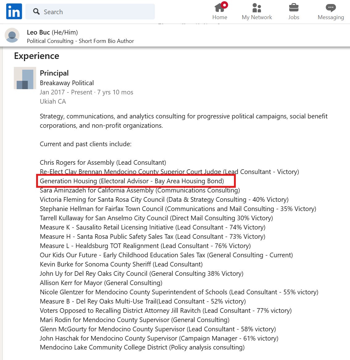 Mr. Buc’s LinkedIn profile indicated that he is Generation' Housing’s (Gen H) Electoral Advisor for the Bay Area Housing Bond.