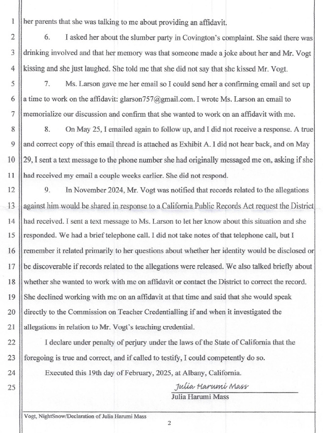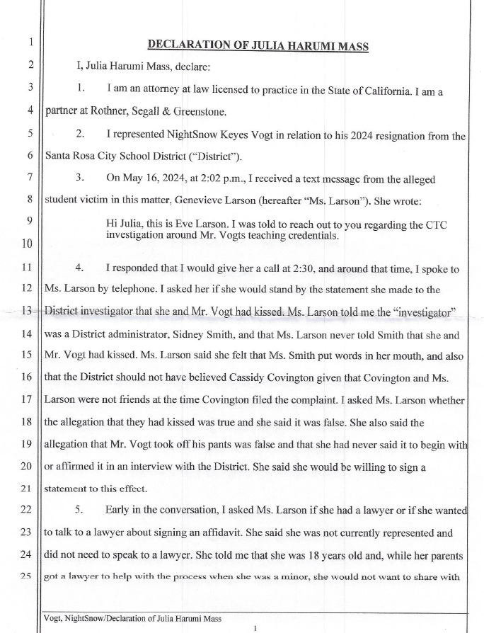 After hearing Ms. Vogt’s story, and viewing the documents she presented, I believe she is presumably telling the truth. She provided me with the student declaration shown below. To my knowledge, Santa Rosa City Schools (SRCS) did not provide me with a copy of the declaration.